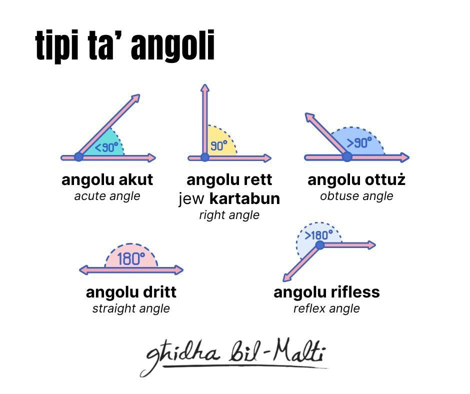Tipi ta' angoli: angolu akut (acute angle), angolu rett jew kartabun (right angle), angolu ottuż (obtuse angle), angolu dritt (straight angle) u angolu rifless (reflex angle). Kartabun ġejja mill-Isqalli cartabbonu jew mit-Taljan quartabuono 📐
